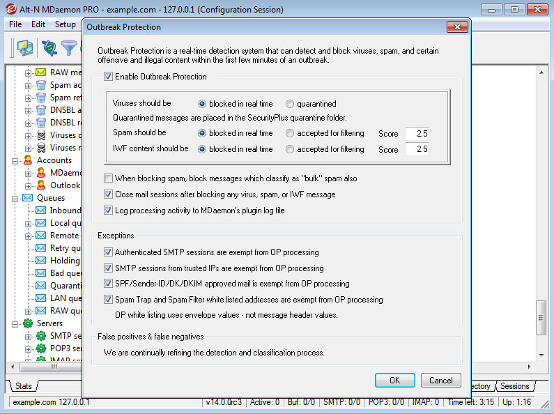 SecurityPlus for MDaemon 是MDaemon公司开发的一个email病毒检查器插件。MDaemon AntiVirus(SecurityPlus) for MDaemon在Email到达邮件服务器时进行病毒扫描。 MDaemon AntiVirus(SecurityPlus)同时扫描邮件的正文和附件,一旦发现问题,MDaemon邮件服务器就会拒绝接收该邮件。有时候,MDaemon会在收取这类邮件后将其隔离,尝试清除其中的病毒或者直接将其删除。而后,可以设置MDaemon AntiVirus(SecurityPlus)是否通知相应发件人或收件人。